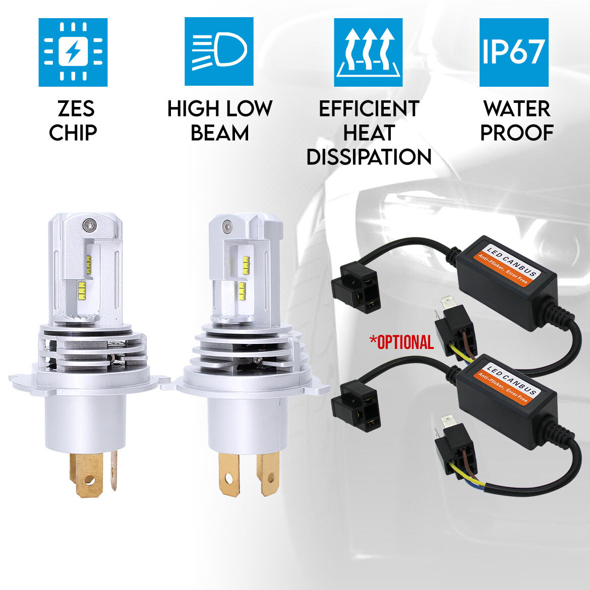 Our LED car headlights are 100% waterproof and temperature proof! It has an IP65 and IP67 waterproof protection grade and an adopted nanoscale waterproof design application to different weather conditions.