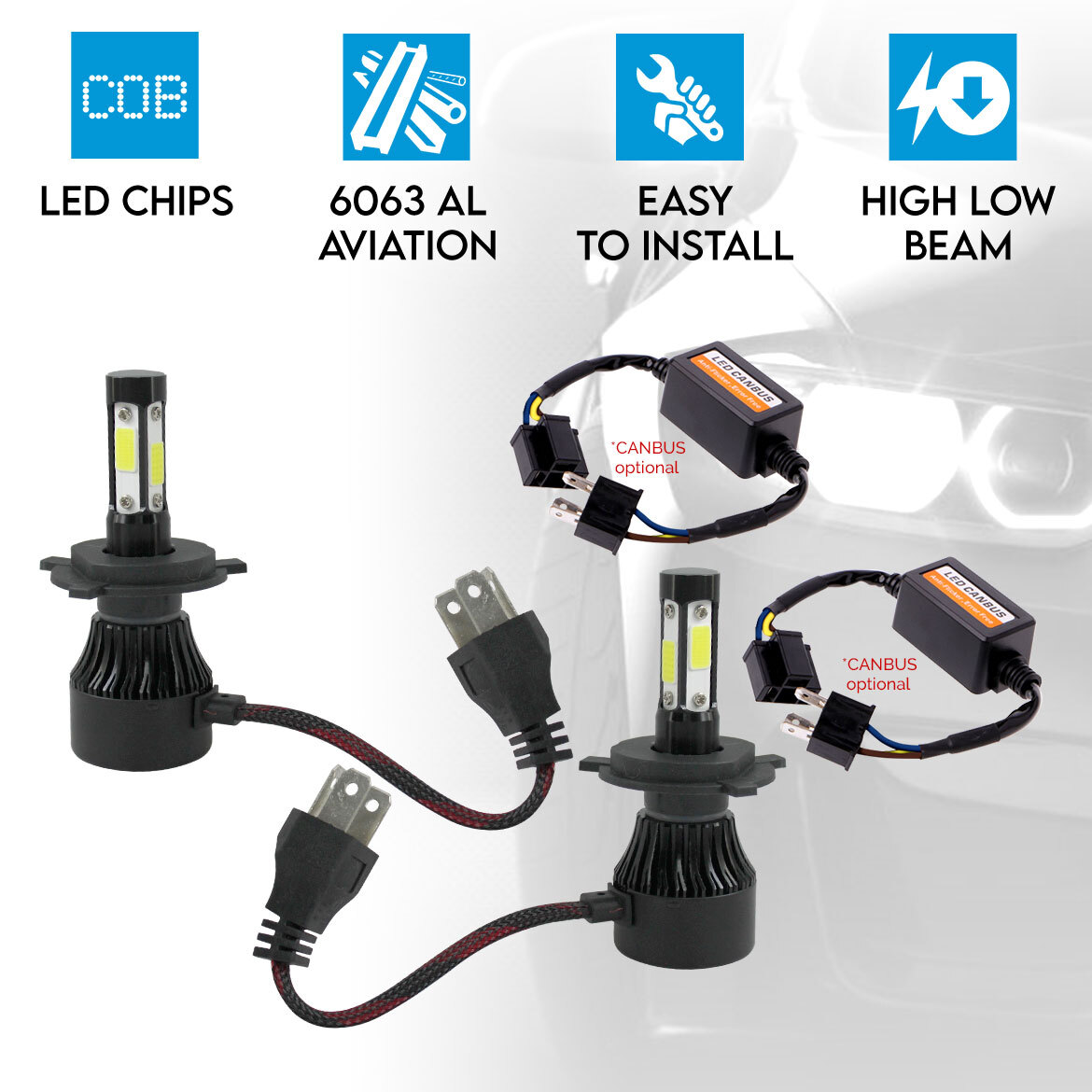 The H7 LED Headlights Kit and our H4 Headlight Bulbs collection gives you the option to use both! Just purchase 2 sets of headlight so you can see clearly during nighttime or in places with no lights at all. The high and low beam function can provide a 360° Beam Angle so it can illuminate the road efficiently. The LED headlight bulbs can light up and make a precisely cut areas of where they shine into, unlike with halogen where the light is bright in the center, but faded around the sides.