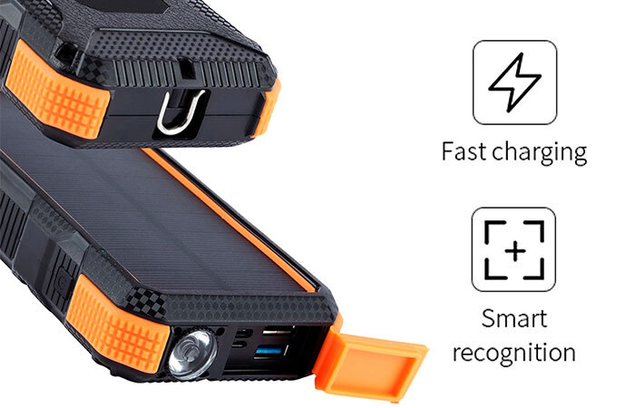 With metal hook to easily hang your powerbank to get charged by the sunlight or hang on your bags to bring it along with you. This unit is rated IP64 making it splashproof and safe from rain, dust, crashes or drops.