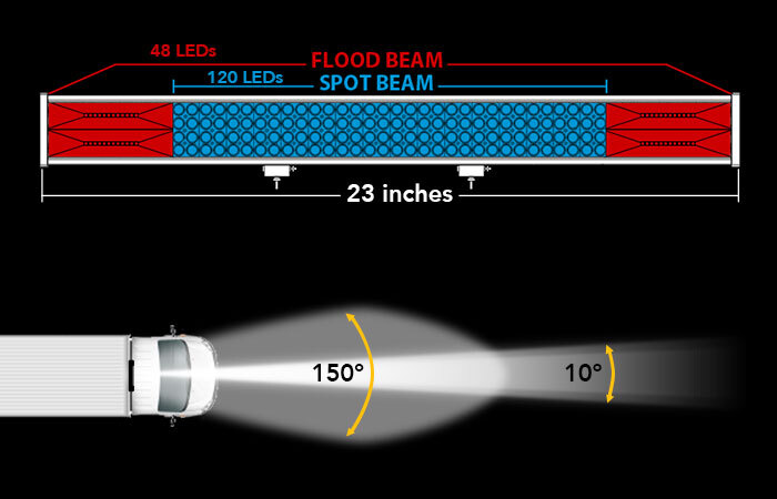 A combination of wide study and experience, it is developed to provide you 1 LUX @ 550metres and 10 degree spot beam, which can reach further distance, as compared to others with 30 degree spot beam and it has 120 degree flood beam which covers wider spread, as compared to others of only 90 degree flood beam. It comes with 168pcs High intensity LEDS that is 120LED@spot beam and 48 LED@flood beam.