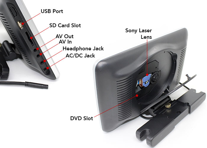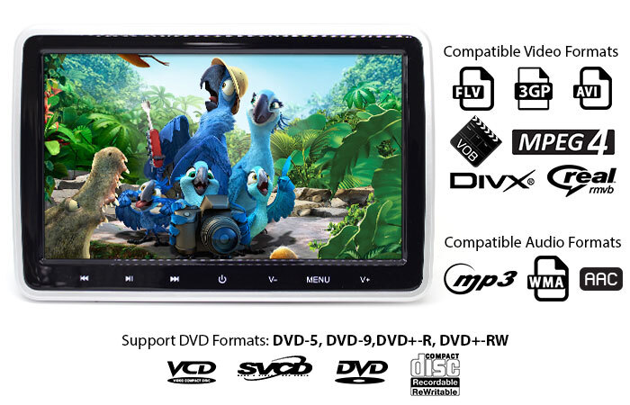 10.1" Digital TFT Screen active headrest dvd player offers an ultra-clear wide screen ratio of 16:9 with 1024*600 resolution providing you sharper images and amazing graphics. You can play High Definition 1080P videos providing you with remarkably clearer pictures and vivid videos.