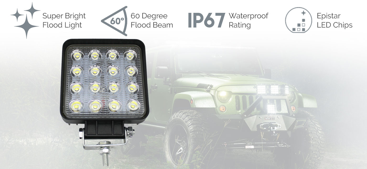 • This 4 inch square work light features 16pcs 3W high intensity Epistar LED chips, That's a total of 48W. It Provides a remarkable 4000LM flood beam that pushes the wide beam out at 60 degree angle