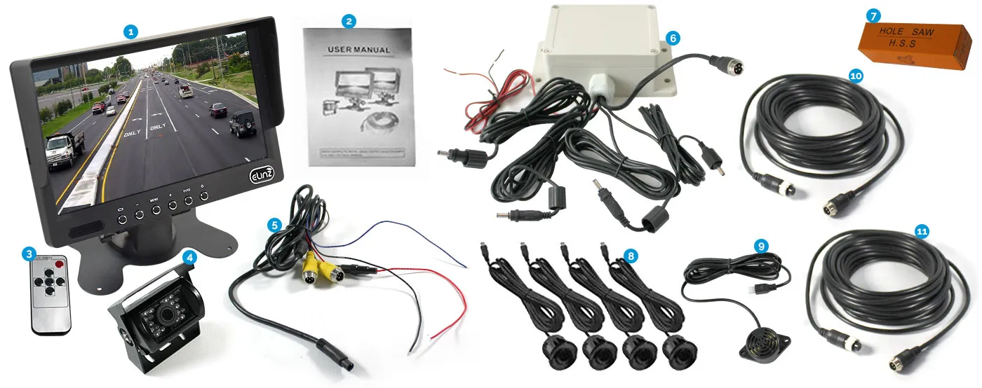 Elinz 7" Monitor Car CCD 4PIN Reversing Camera 90° 600TVL Ultrasonic Parking Sensors
