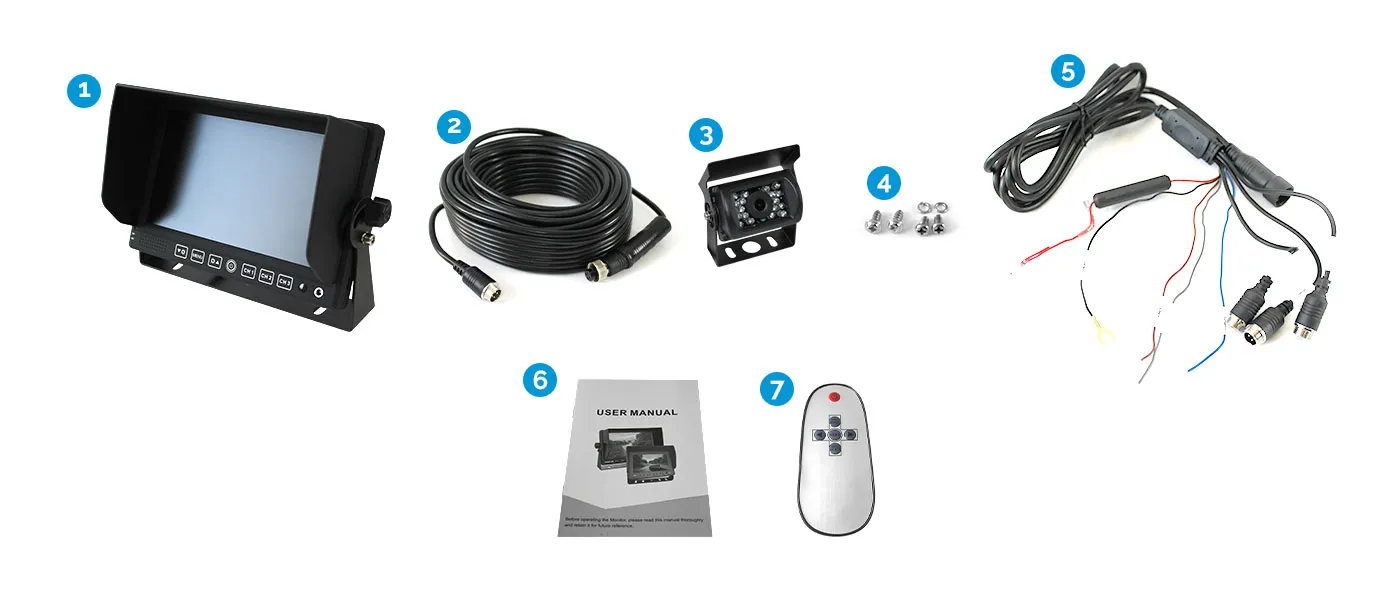 This 7" monitor reverse camera kit is suitable for 12V or 24V vehicle. It has voltage overload protection and reverse polarity protection to ensure the monitor and cameras are not damaged by fitting errors. It is mounted by a substantial U-bracket and sunshade to keep the sun off the monitor.