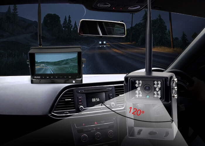 Uninterrupted connection in Multi-Angle of the cameras matched with 7" SplitScreen Monitor will give you asatisfactory output. It has a camera with 120 degree view angle and 2.4Ghz transmission.