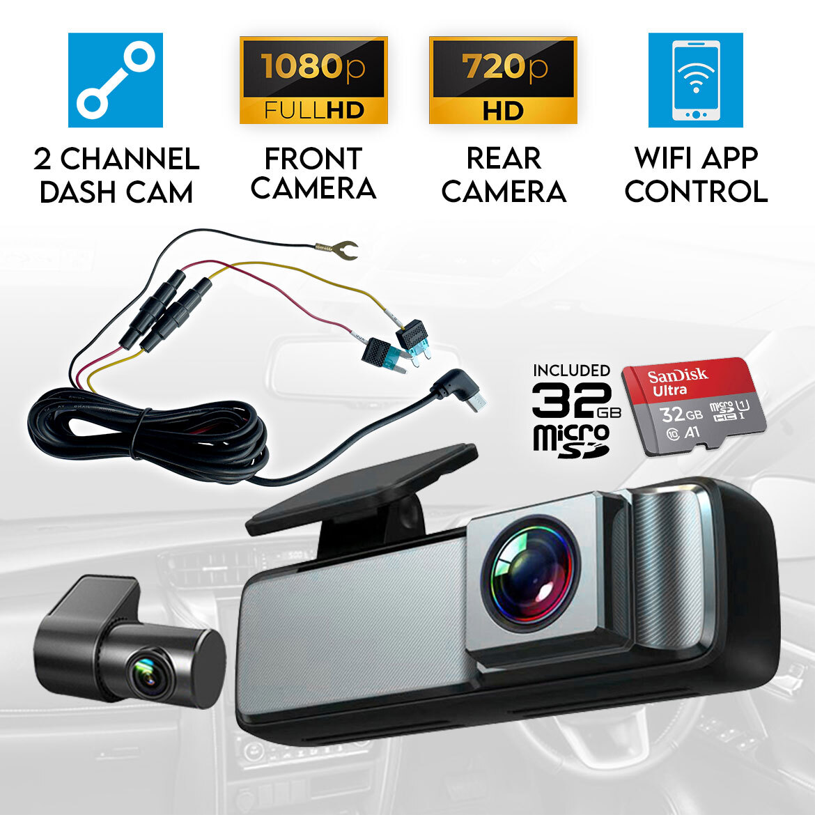 Elinz Dual Lens No Screen Dash Cam 1080P+720P WiFi App Control Supercapacitor Compact Discreet Car DVR 32GB Hardwire Kit