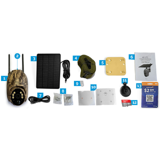 The Elinz 4G Cellular PTZ Solar Powered Camouflage Outdoor Security Camera is a versatile surveillance solution designed for locations without Wi-Fi, operating on 4G LTE coverage in Australia. Its camouflage pattern makes it discreet in outdoor settings like farms and wildlife areas, while its solar-powered and wire-free design allows easy installation. With features such as 2K video resolution, pan-tilt-zoom capability, two-way talk, and motion detection with a siren alarm, this weatherproof camera offers comprehensive security. Additionally, it supports local storage with a Sandisk 32GB MicroSD card and optional cloud storage, featuring an ALDI Sim for connectivity.