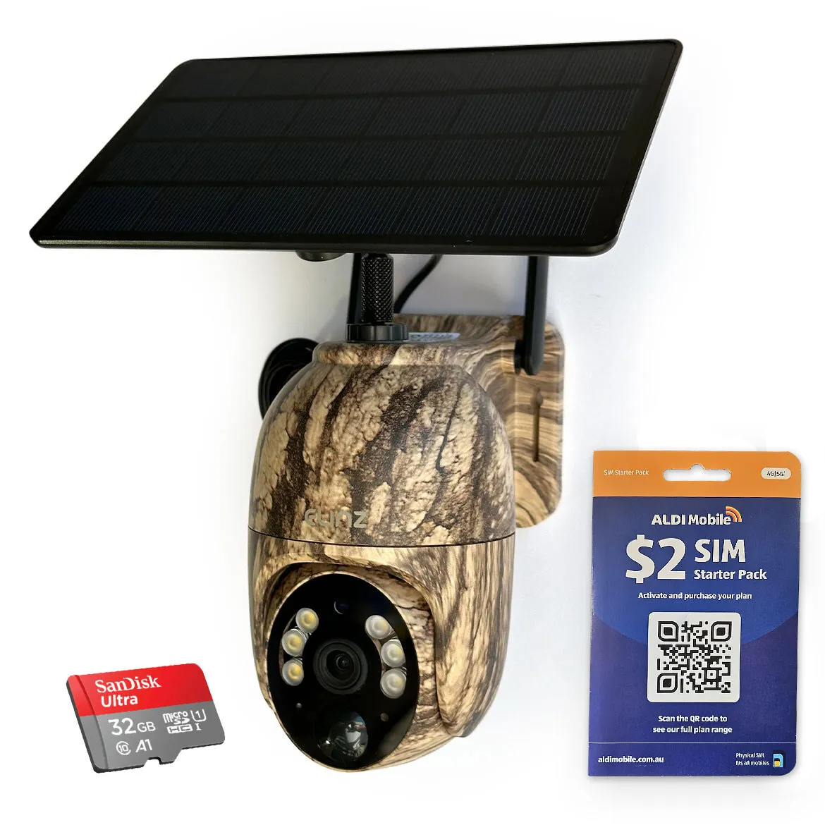 Elinz 4G Cellular PTZ Solar Powered Camouflage Outdoor Security Camera 3MP 2K HD Resolution 360° IP65 for Trail Wildlife Surveillance CCTV 32GB Aldi
