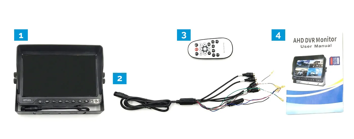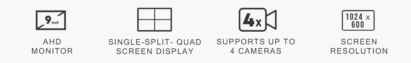 The Elinz 9" AHD Monitor features a crisp 1024×600 display with support for up to four cameras, offering flexible single, split, or quad screen viewing for enhanced visibility. With built-in DVR recording, real-time footage capture, and up to 256GB SD card support, it delivers reliable monitoring for a wide range of 4-pin AHD camera systems.