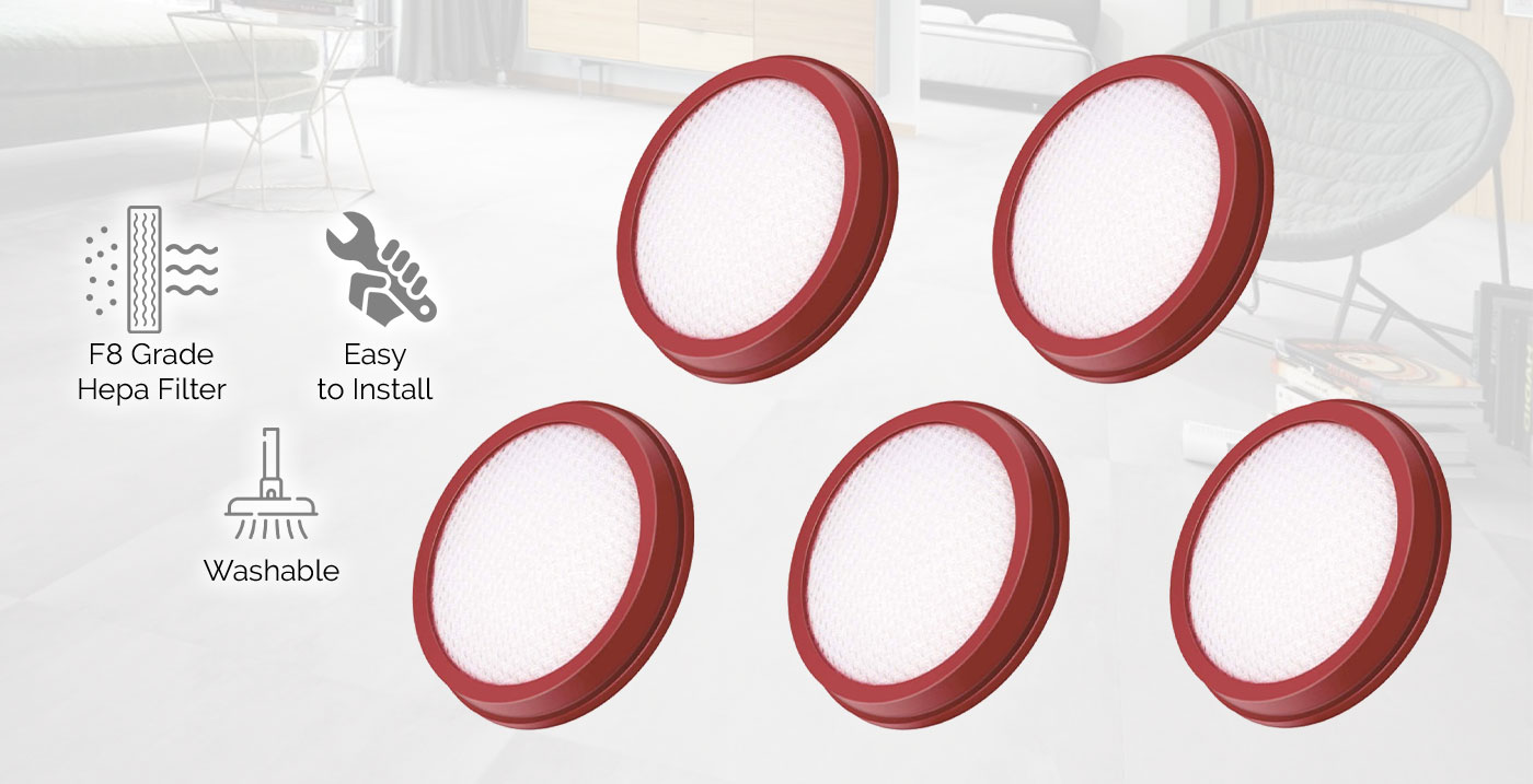 This F8 grade HEPA filter offers 99.7% efficiency to filter very fine dust particles up to 0.3 microns. This filters are designed for Elinz Foldable Cordless Vacuum Cleaner VCHSG10 only. This replacement filter is washable and very important to be completely dry before placing it back in your vacuum. The package contains 5pcs filter pads.