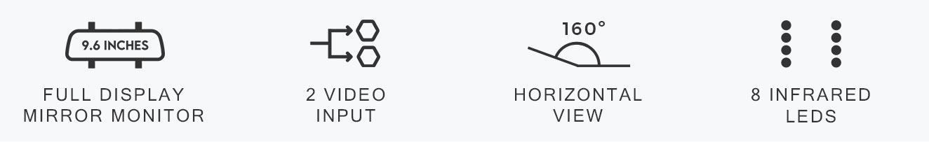 • 9.6 Inch Full Display Mirror Monitor - High-resolution 320×1280 screen delivers detailed and clear images for enhanced rear and reverse viewing.