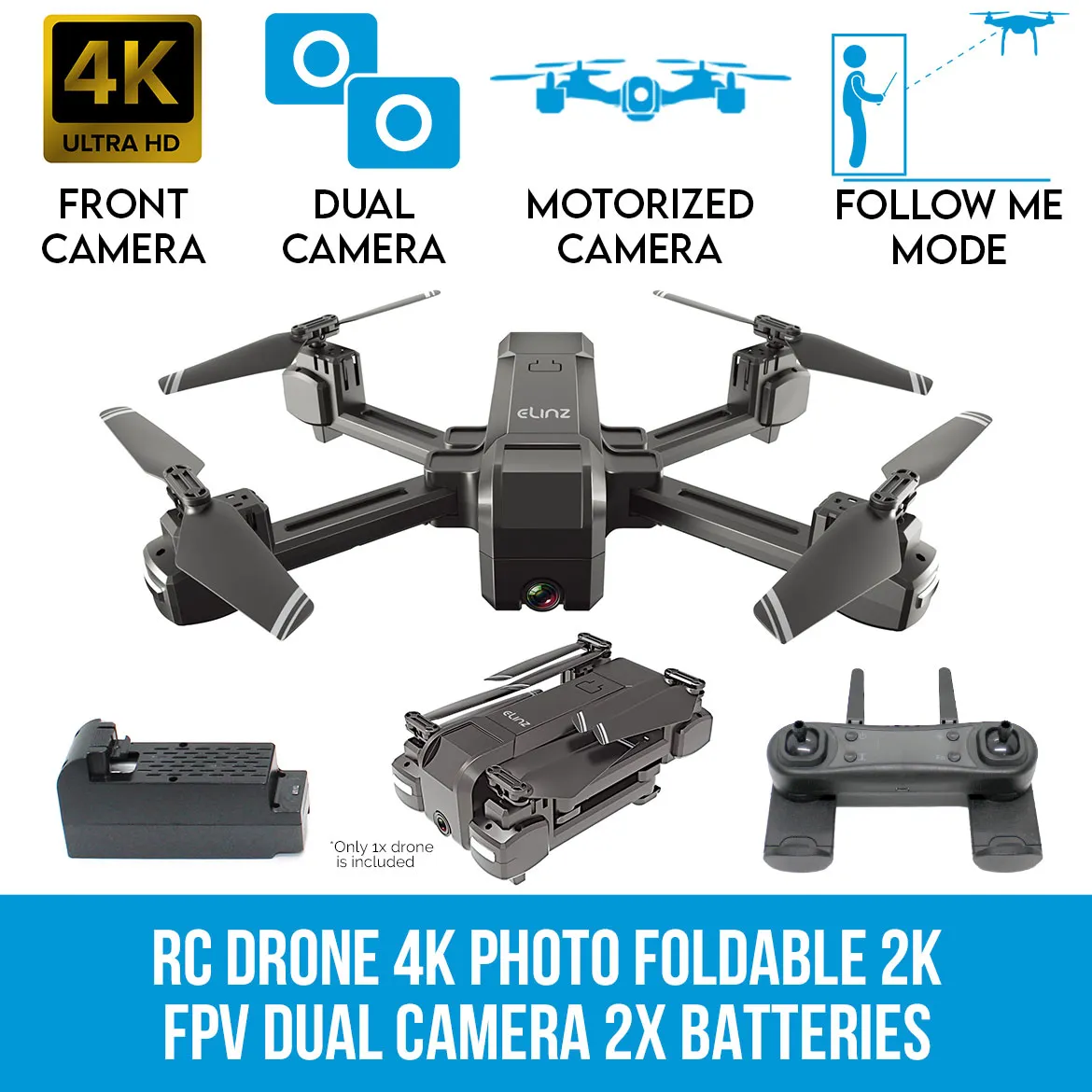 Elinz RC Drone 4K Photo Foldable 2K FPV Dual Camera 2.4Ghz WiFi Quadcopter Brush Motor 1080P 2x Battery