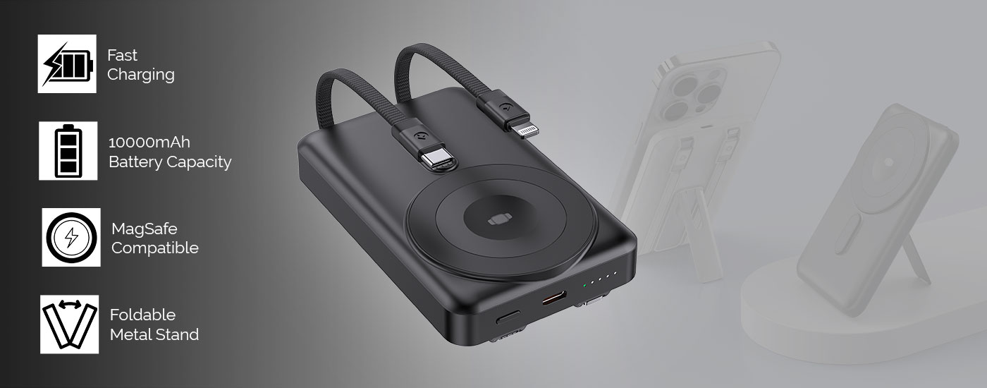 The Magnetic Portable Fast Charging 10000mAh Power Bank is your go-to for convenient, reliable charging. With MagSafe and Qi wireless compatibility, it supports fast charging of up to 15W and wired charging of up to 22.5W. The 10,000mAh battery offers up to two full iPhone charges, while a built-in foldable stand allows hands-free use. Compact and travel-ready, it also features Apple Watch charging, LED battery indicators, and multi-safety protection for peace of mind on the go.