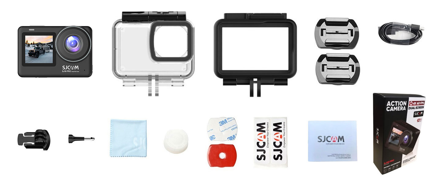 The SJ10 Pro Dual Screen action camera has some accessories pre-installed in the box. These items include: waterproof Case and 1300mAh Li-ion Battery.