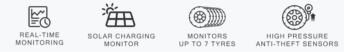 • Monitors up to 7 tyres including spare, perfect for RVs, Caravan, Trailers, Dually Utes, etc.