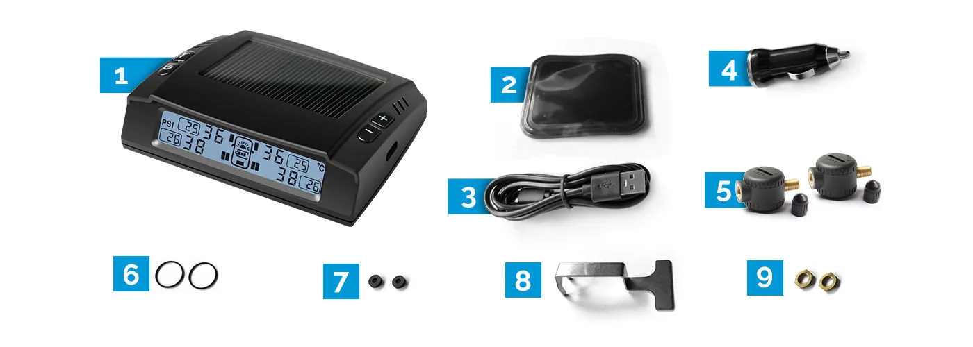 • Provides real-time pressure and temperature for each tyre, which prevents dangerous blowouts, improves fuel efficiency, extends tyre life through even wear. Monitor your tyre pressure accurately from 0 to 99 PSI and temperature data within ±1.5 PSI or ±3°F accuracy.