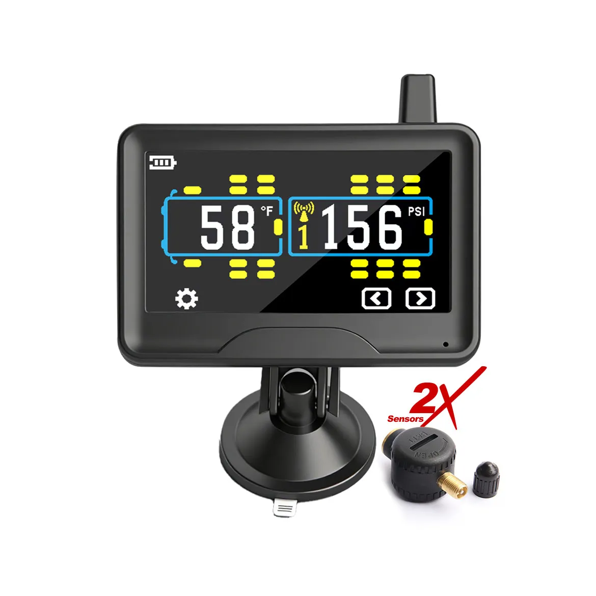 • Provides real-time pressure and temperature for each tyre, which prevents dangerous blowouts, improves fuel efficiency, extends tyre life through even wear. Monitor your tyre pressure accurately from 0 to 218 PSI and temperature data within ±1.5 PSI or ±3°F accuracy.