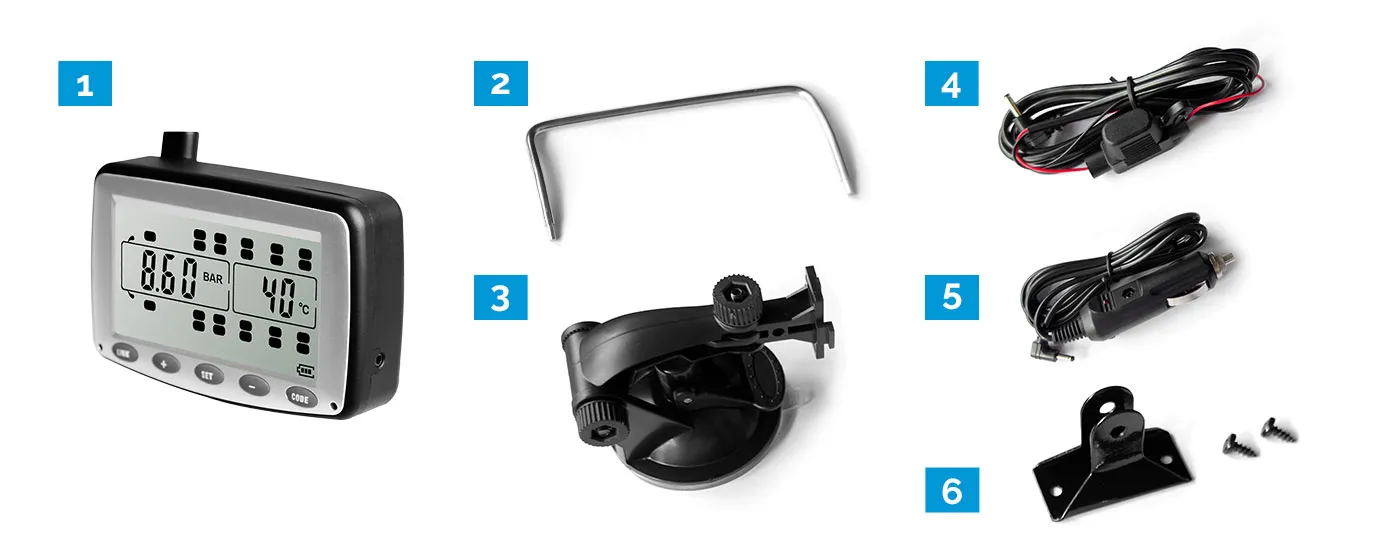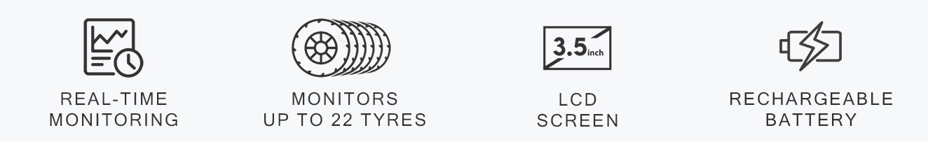 • Provides real-time pressure and temperature for each tyre, which prevents dangerous blowouts, improves fuel efficiency, extends tyre life through even wear. Monitor your tyre pressure accurately from 0 to 189 PSI and temperature data within ±1.5 PSI or ±3°F accuracy.