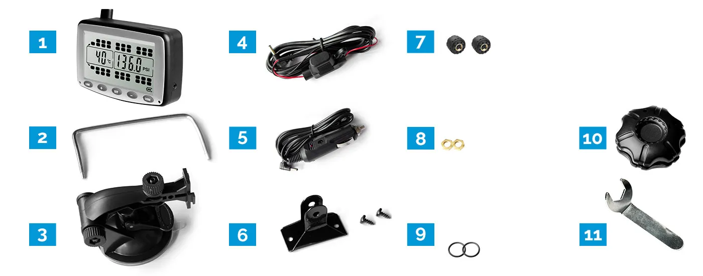 • Provides real-time pressure and temperature for each tyre, which prevents dangerous blowouts, improves fuel efficiency, extends tyre life through even wear. Monitor your tyre pressure accurately from 0 to 189 PSI and temperature data within ±1.5 PSI or ±3°F accuracy.