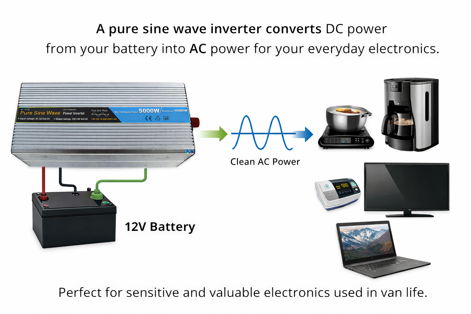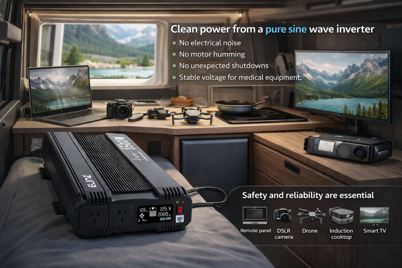 Unlike cheaper models, pure sine wave inverters produce a clean, stable waveform that closely resembles grid electricity. This clean power makes them ideal for the sensitive and valuable electronics used in van life setups.