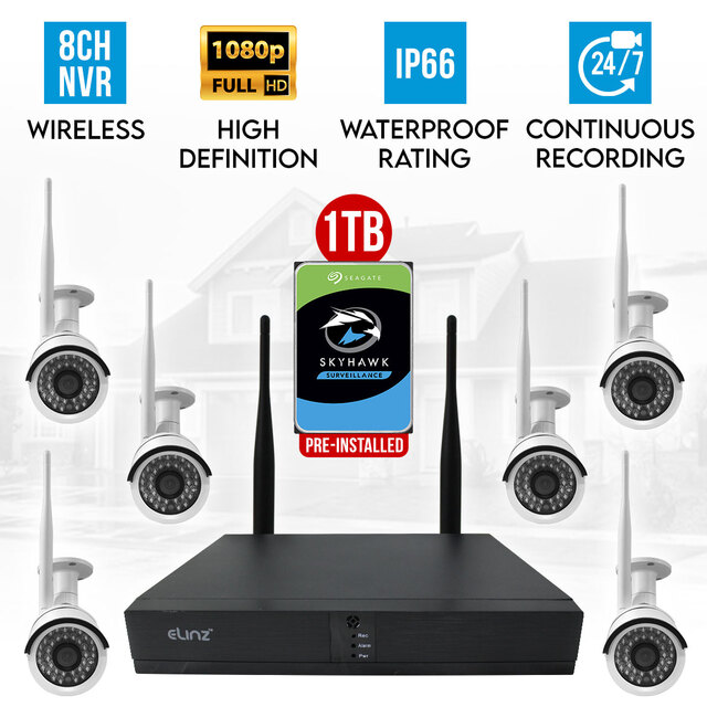Elinz Wireless Home Battery Security 1080P HD WiFi 6x Cameras CCTV System 8CH NVR Indoor Outdoor 1TB